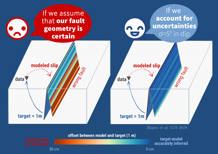The ill-posed nature of earthquake source estimation derives from several factors including the quality and quantity of available observations and the fidelity of our forward theory. Observational errors are usually accounted for in the inversion process. Epistemic errors, which stem from our simplified description of the forward problem, are rarely dealt with despite their potential to bias the estimate of a source model. In this study, we explore the impact of uncertainties related to the choice of a fault geometry in source inversion problems. The geometry of a fault structure is generally reduced to a set of parameters, such as position, strike and dip, for one or a few planar fault segments. While some of these parameters can be solved for, more often they are fixed to an uncertain value. We propose a practical framework to address this limitation by following a previously implemented method exploring the impact of uncertainties on the elastic properties of our models. We develop a sensitivity analysis to small perturbations of fault dip and position. The uncertainties of our fixed fault geometry are included in the inverse problem under the formulation of the misfit covariance matrix that combines both prediction and observation uncertainties. We validate this approach with the simplified case of a fault that extends infinitely along strike, using both Bayesian and optimization formulations of a static slip inversion. If epistemic errors are ignored, predictions are overconfident in the data and slip parameters are not reliably estimated. In contrast, inclusion of uncertainties in fault geometry allows us to infer a robust posterior slip model. Epistemic uncertainties can be many orders of magnitude larger than observational errors for great earthquakes (Mw > 8). Not accounting for uncertainties in fault geometry may partly explain observed shallow slip deficits for continental earthquakes. Similarly, ignoring the impact of epistemic errors can also bias estimates of near-surface slip and predictions of tsunamis induced by megathrust earthquakes.